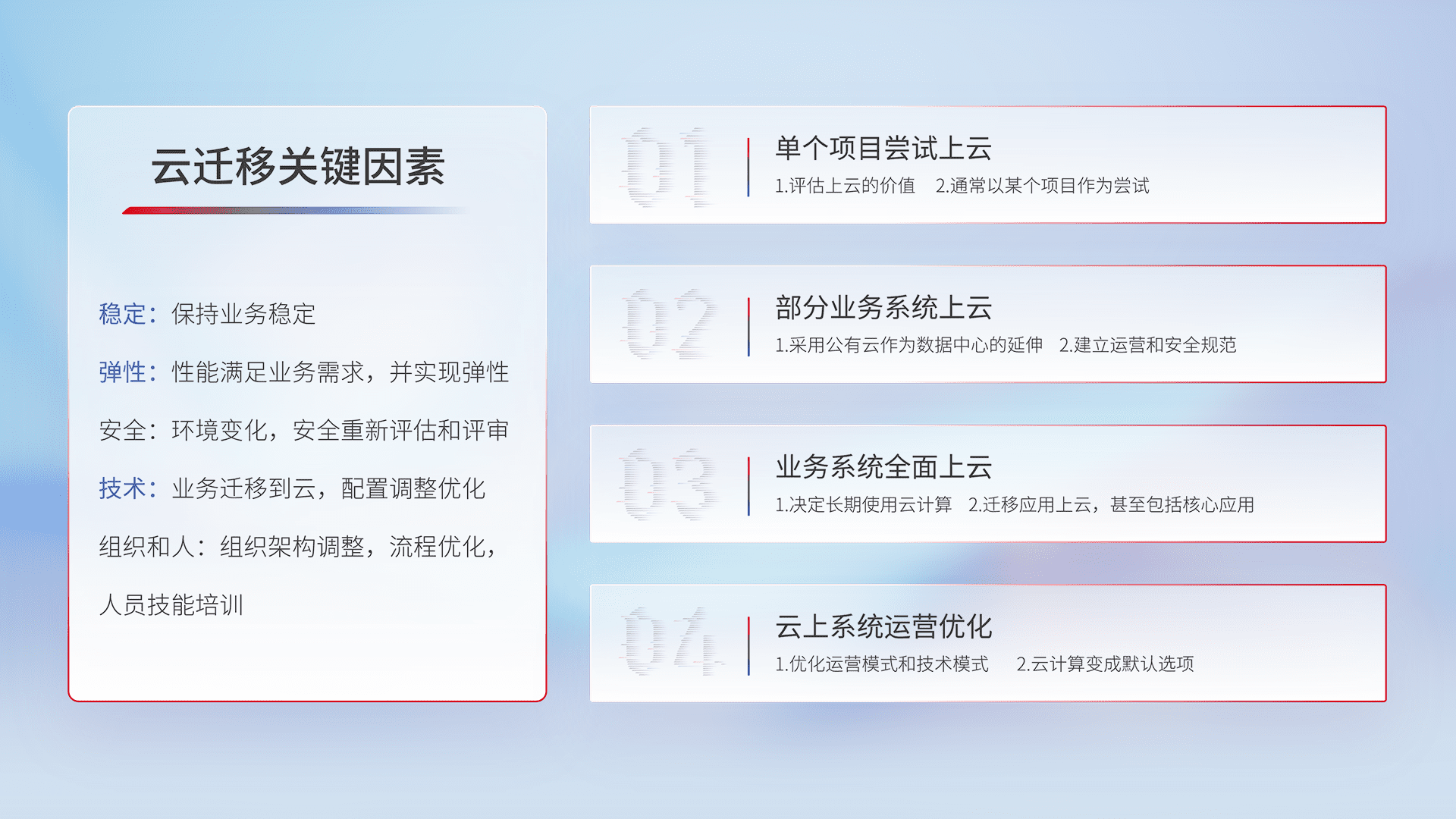 结合实际业务,,,从规划设计、、云平台选型、、云原生改造、、、、数据迁移、、、、集成交付,,,,迁移全过程为客户识别最佳上云路径,,,,做好风险识别管理,,,,设计网络架构、、身份权限、、、、安全审计合规、、、、操作审计、、、、日志审计、、监控告警策略、、、多站点容灾设计等,,,对云上基础设施进行整体规划,,,提升IT治理水平,,,以满足弹性、、、高可用、、、高性能的需求。。