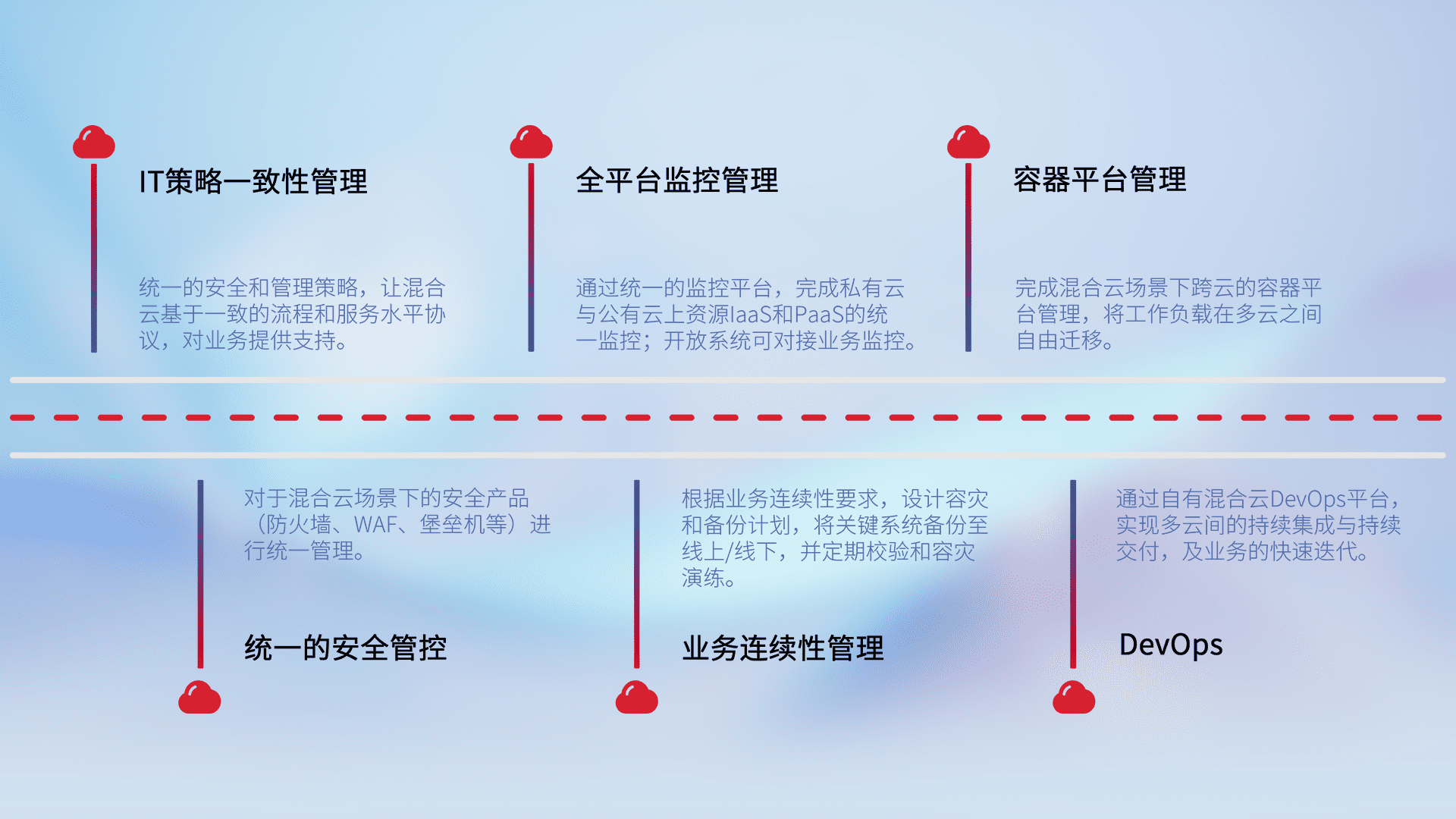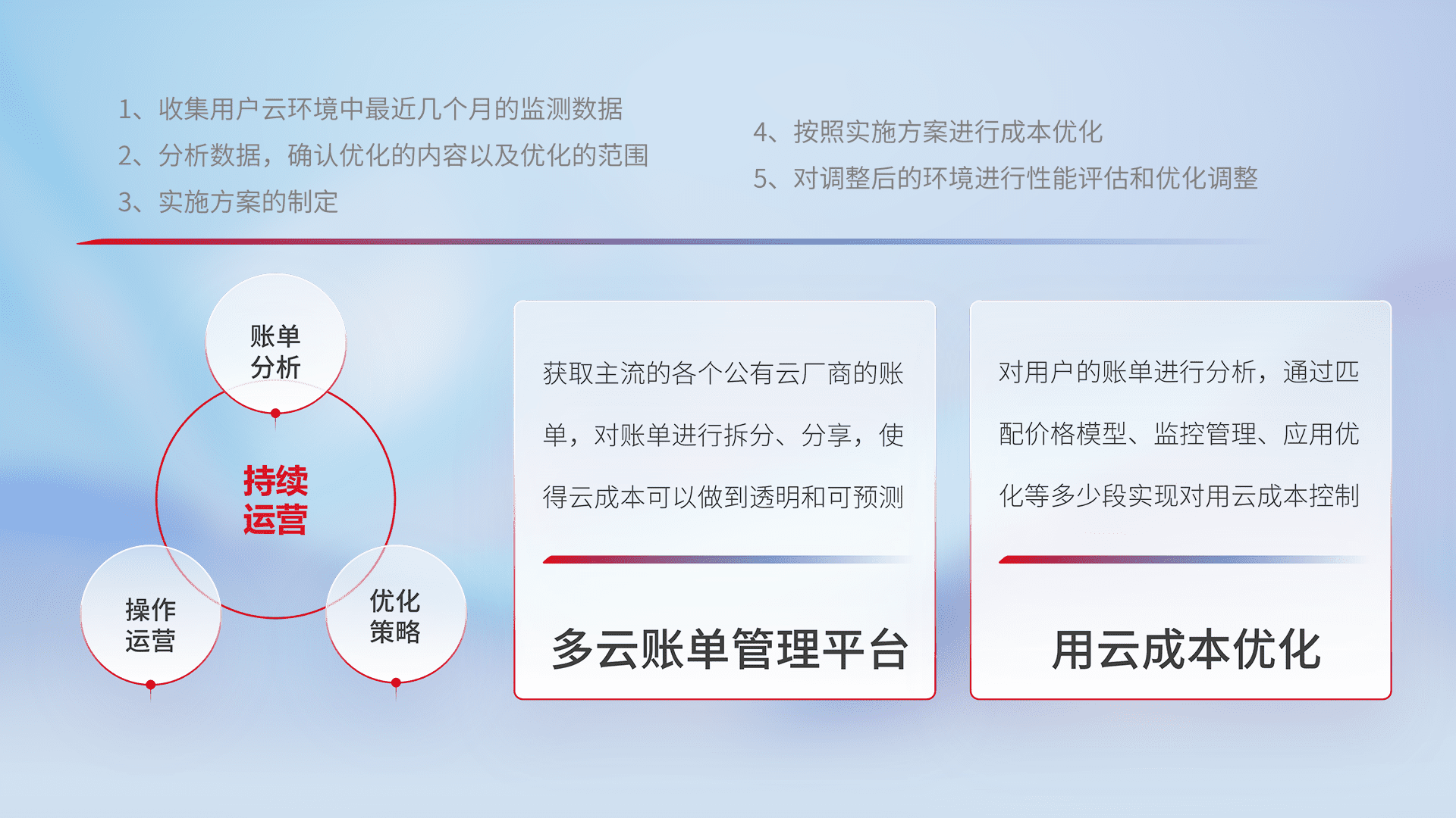 通过多云纳管,,,,以统一的资源数据模型把客户的云资源进行抽象和封装,,,,进而实现对多云资源的统一操作,,,,保障云资源管理的可靠性、、稳定性与可用性。。。量身定制化运维内容,,,配置、、、开发运维、、、补丁管理、、备份、、、、监控、、认证和访问管理、、审计和日常巡检等,,保障在用云过程中的可靠度,,,稳定度以及高可用率。。。。